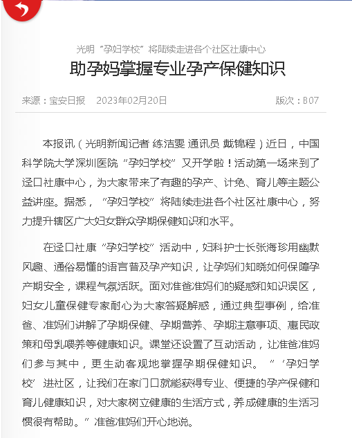 宝安日报:光明“孕妇学校”将陆续走进各个社区社康中心助孕妈掌握专业孕产保健知识