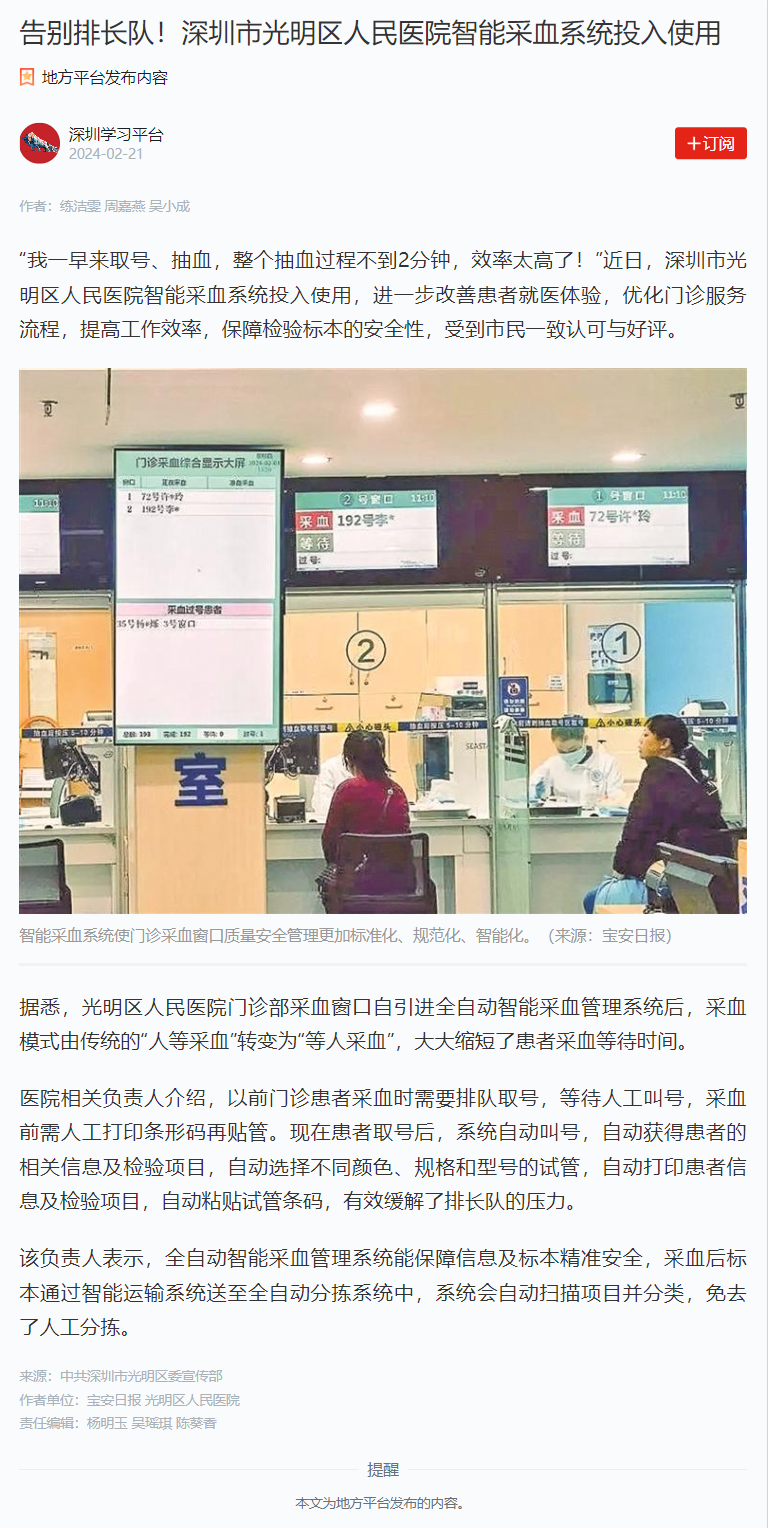 学习强国:告别排长队!深圳市光明区人民医院智能采血系统投入使用