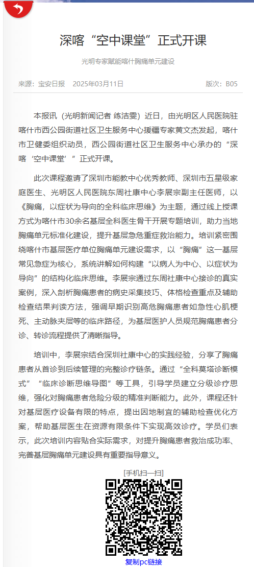 宝安日报:深喀“空中课堂”正式开课 光明专家赋能喀什胸痛单元建设