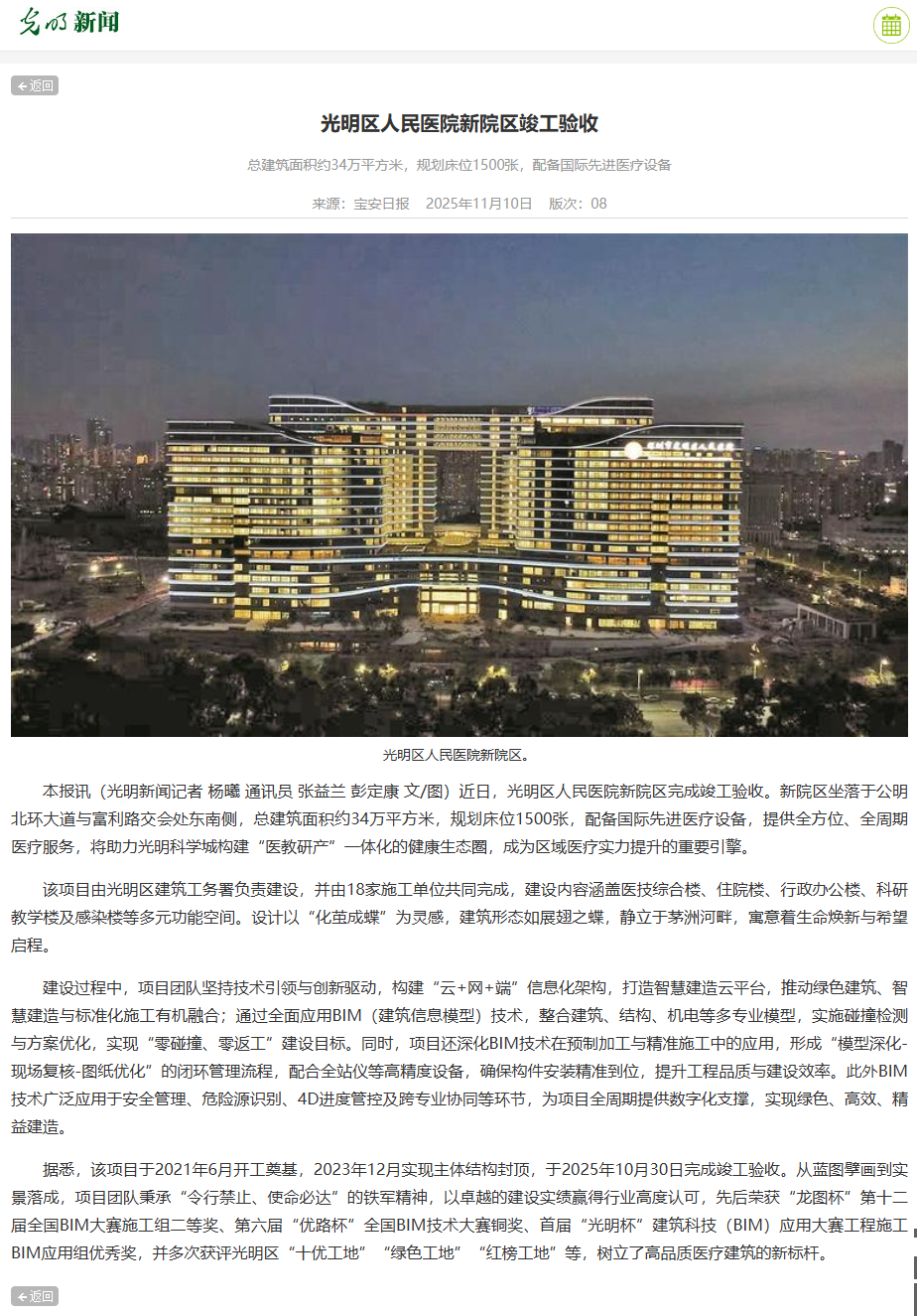 光明新闻:光明区人民医院新院区竣工验收 总建筑面积约34万平方米,规划床位1500张,配备国际先进医疗设备