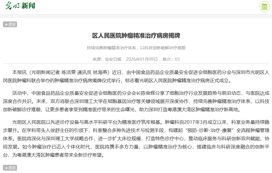 光明新闻:区人民医院肿瘤精准治疗病房揭牌 持续完善肿瘤精准治疗体系,以科技创新破解诊疗难题
